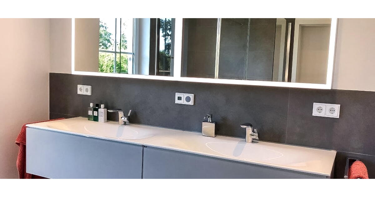 Schon beim ersten Termin wurde klar: Das rund zehn Quadratmeter große Familienbad bietet beste Voraussetzungen für ein modernes Wohlfühlkonzept. Besonders das bodentiefe Fenster bringt viel Tageslicht in den Raum und eröffnet den Blick ins Grüne – ein zentrales Element auch im neuen Design. Zusätzlich wünschte sich die Familie eine große, begehbare Dusche sowie einen Doppelwaschtisch mit viel Stauraum.