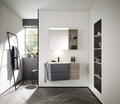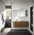 Der Lichtspiegel Badu des Herstellers burgbad bringt Ihr Badezimmer zum Leuchten und beschert zugleich eine raffinierte Stauraumlösung. Das eckige Design schafft Klarheit und Kombistärke, wodurch es sich erstklassig in die verschiedensten Badstile einfügt. Für ganz besondere Lichtmomente sorgt die LED-Lichtleiste oben, dessen Licht sich per Dimmschalter ganz individuell einstellen lässt. Beeindruckend zeigt sich das geräumige Innenleben: Auf den edlen Glaseinlegeböden kommen zahlreiche Utensilien und Pflegeprodukte garantiert unter. Der Badu Spiegelschrank ist in verschiedenen Größen erhältlich und präsentiert sich in hochwertiger Holzverkleidung mit Metallleisten und Griffen seitlich.