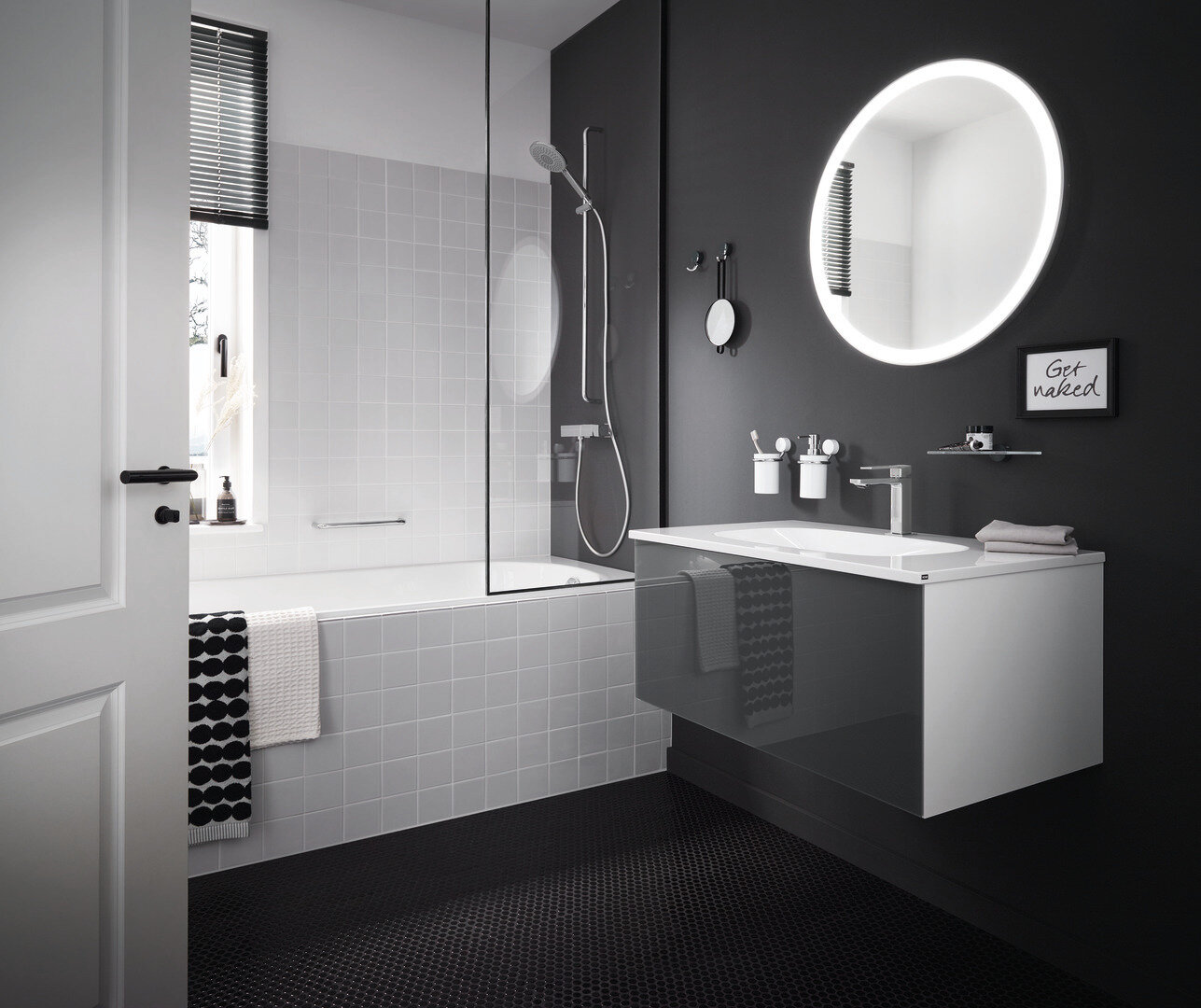 Geometrische Grundformen bestimmen die Formensprache von System 815. Elemente aus gebogenem Stahl betonen die filigrane Gestaltung des Sanitärsystems und geben ihm seine Leichtigkeit. Trotz minimalistischen Materialeinsatzes zeichnen sich die Sanitär-Accessoires für Waschtisch, WC und Dusche durch