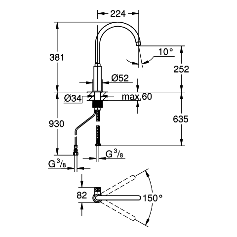 Schwenkbereich 150 Grad