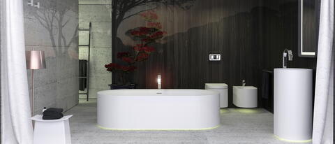 Ganz schön futuristisch zeigt sich die freistehende Badewanne Moon. Ihre sanften Rundungen aus K|Stone und die gedämpfte Beleuchtung erinnern an den Himmelskörper, der nachts in unsere Fenster scheint. Überzeugendes Design von Peter Jamieson für KNIEF. Die freistehende Wanne Moon schimmert weiß und wird von unten sanft angestrahlt - wie der Mond. Und dank K|Stone fühlt sie sich auch an wie der Himmelskörper. Denn die Oberfläche des durchgefärbten Mineralwerkstoffs wirkt wie Naturstein und ist ein haptisches Erlebnis. Mit diesem exklusiven Material ist übrigens auch der Ablauf bezogen, der sich auf leichten Druck öffnet oder schließt.