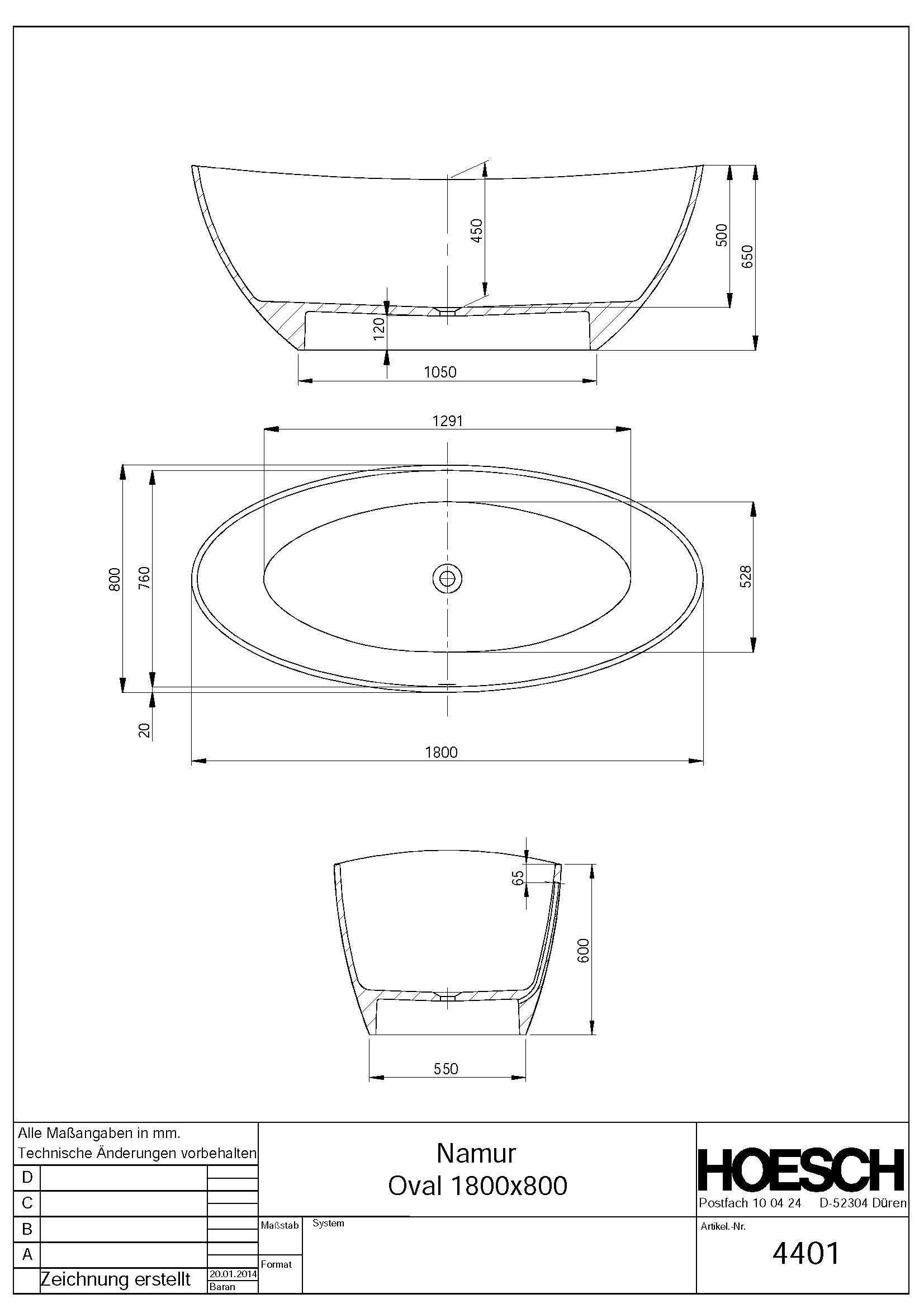 Badewanne Mineralguss Namur 180x80cm freisteh.m.Ablaufga.Solique weiss Hoesch