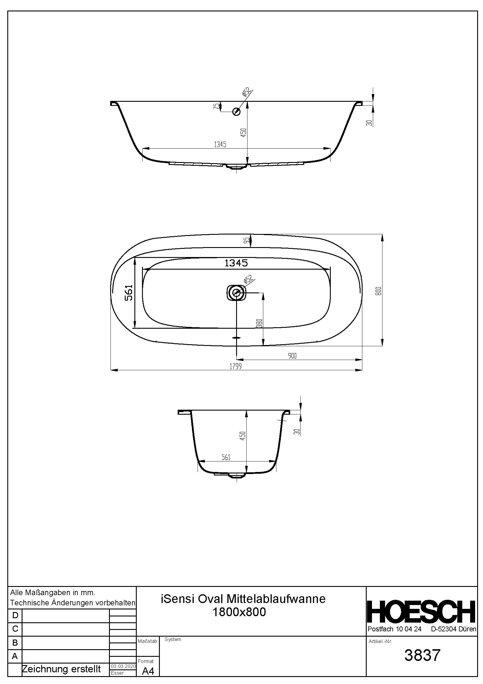 Badewanne Acryl iSensi Oval 180x80cm ohne Füsse weiss Hoesch