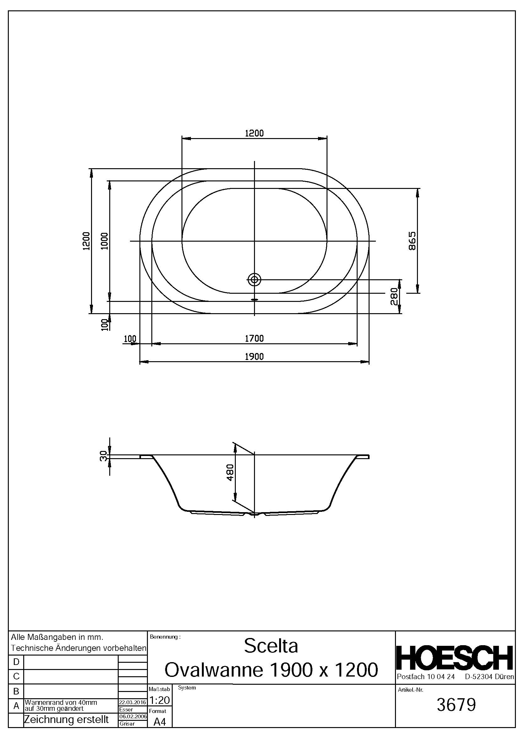 Ovalwanne Acryl Scelta 190x120cm weiss Hoesch