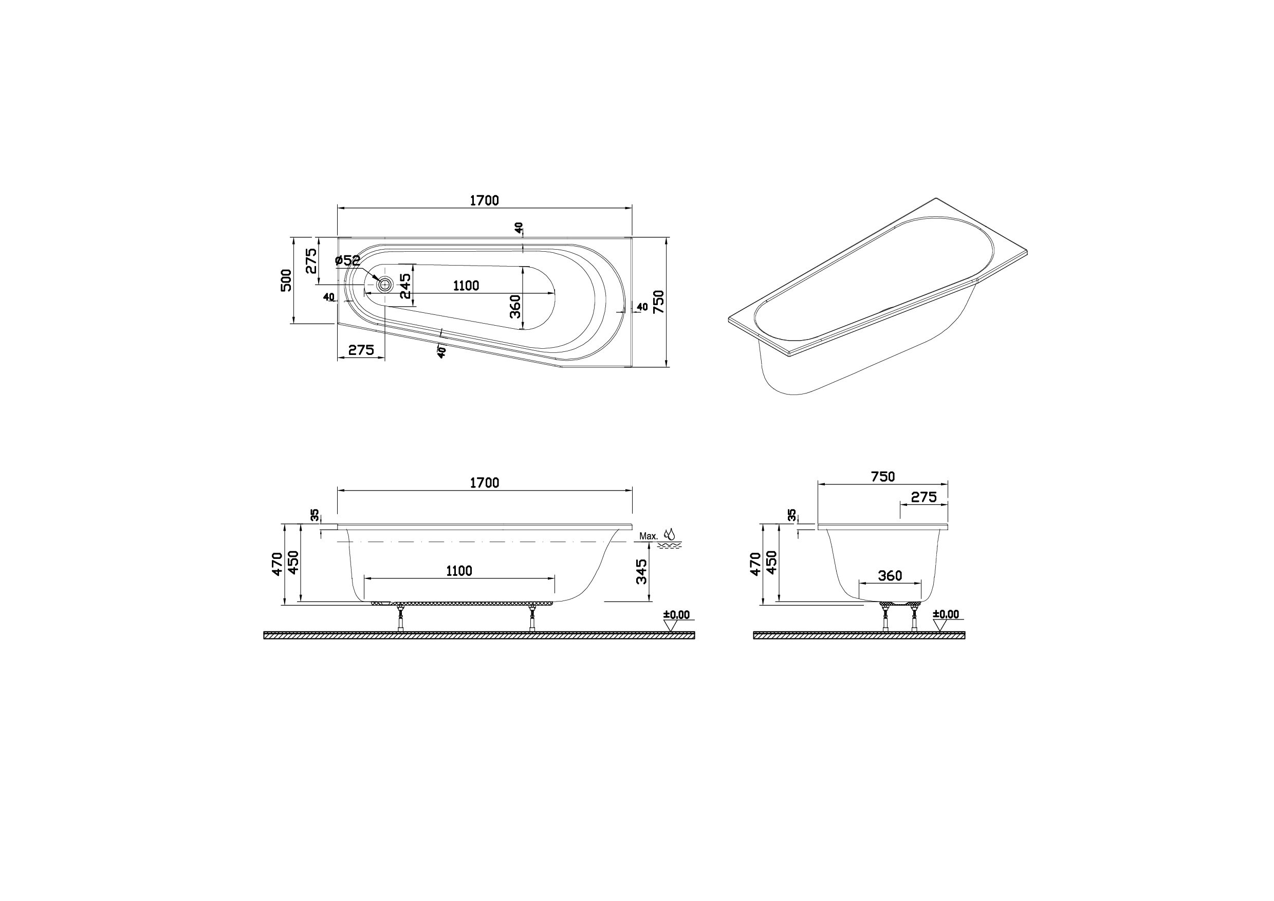 Raumsparwanne Acryl V3 170x75x50cm Ab-/Überl.Liegefl. rechts weiss VIGOUR