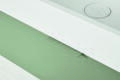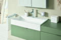 Die schlichten Möbelfronten in Salbeigrün werden von farbgleichen Griffen und großzügigen Waschbecken aus Mineralwerkstoff ergänzt. Ebenfalls fein gerundet, setzt die glänzend verchromte Waschbeckenarmatur schicke Akzente. Die geräumigen Spiegelschränke sind wahlweise als Vorbau oder als Unterbau erhältlich.