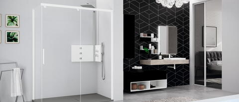 Die Pendeltür Kuadra 2.0 von NOVELLINI bereichert moderne Bäder mit anspruchsvollem Look. Sie präsentiert sich in bewährtem, minimalistischem Design. Dieses entsteht nicht zuletzt durch die clever verdeckten Wandprofile. Sowohl zur Boden- als auch zur Wannenmontage geeignet, kann das Türelement mit einer Seitenwand kombiniert werden, ist aber auch für Nischenlösungen die ideale Wahl. Für ein perfektes Gleiten sorgt das spezielle Soft-Closing-System. Kugelgelagert, gleitet die Tür sanft und besonders leise dahin. Wählen Sie dazu eine Profilfarbe, die zu Ihnen und Ihrem Badezimmer passt: Silber, Chrom, Weiß oder Schwarzmatt.
