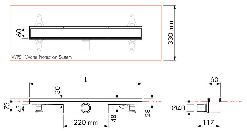 Länge: 1000 mmEinbautiefe mit Siphon: 73