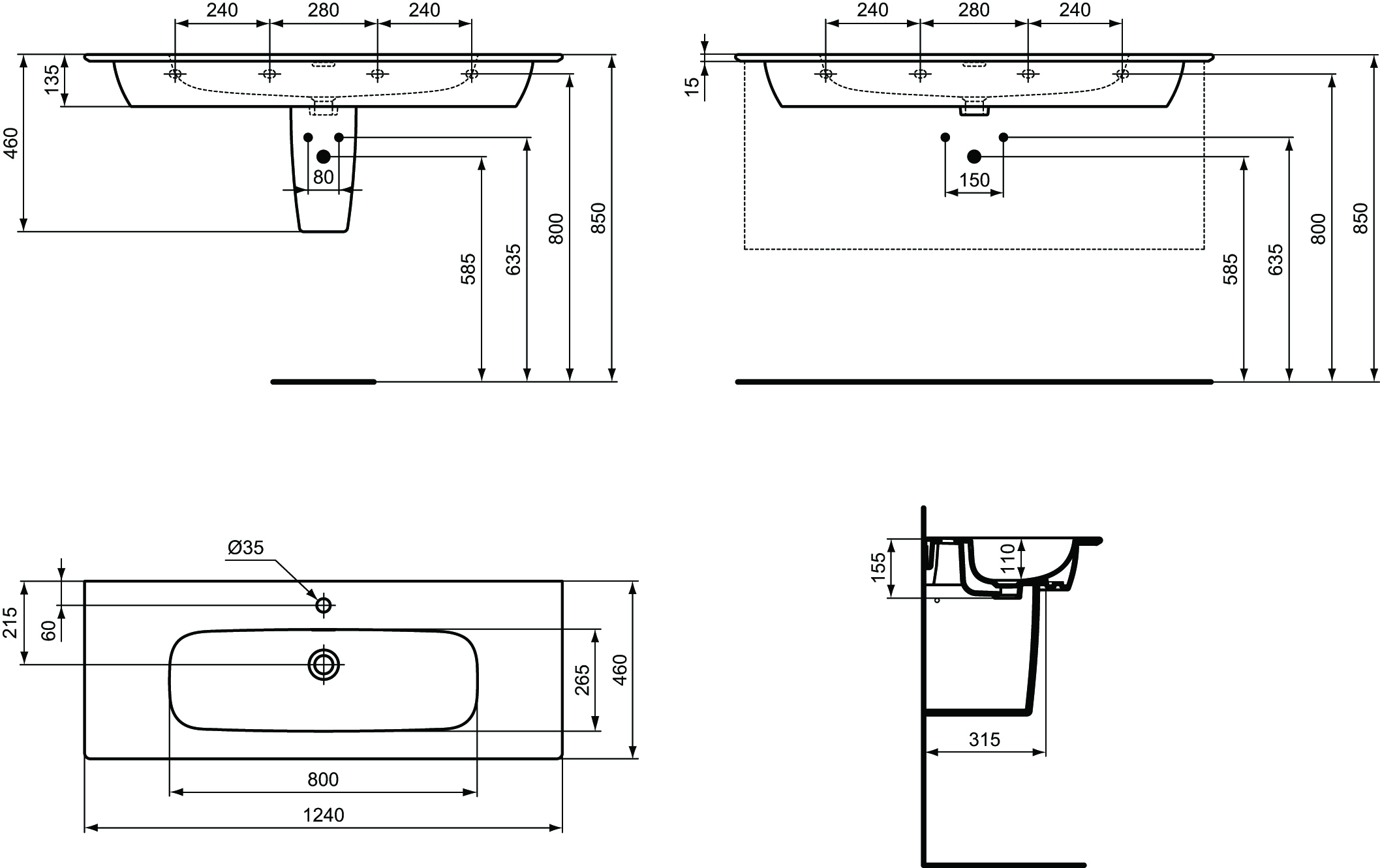 Möbelwaschtisch TESI 124x46.2x15.6cm weiss IdealPlus Ideal Standard