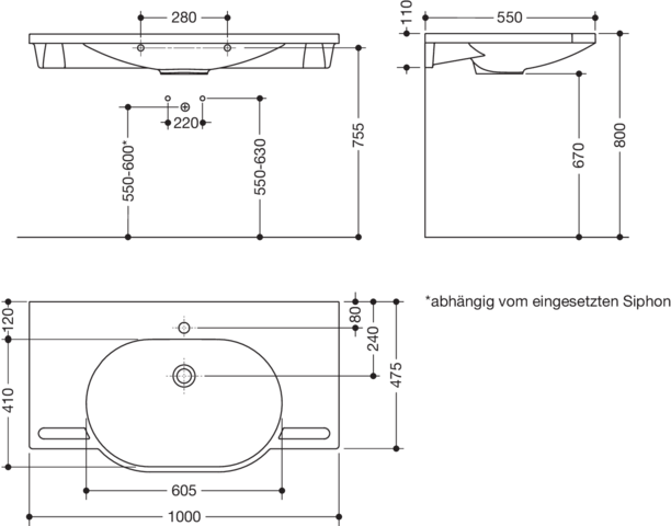 Mineralguss-Waschtisch Hewi 1000x550mm m.Hahnl./o.Überlauf integr.HTH weiss