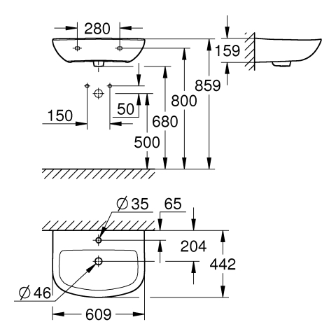 Waschtisch Bau 60.9x44.2cm m.Hahnloch m.Überlauf weiss Grohe