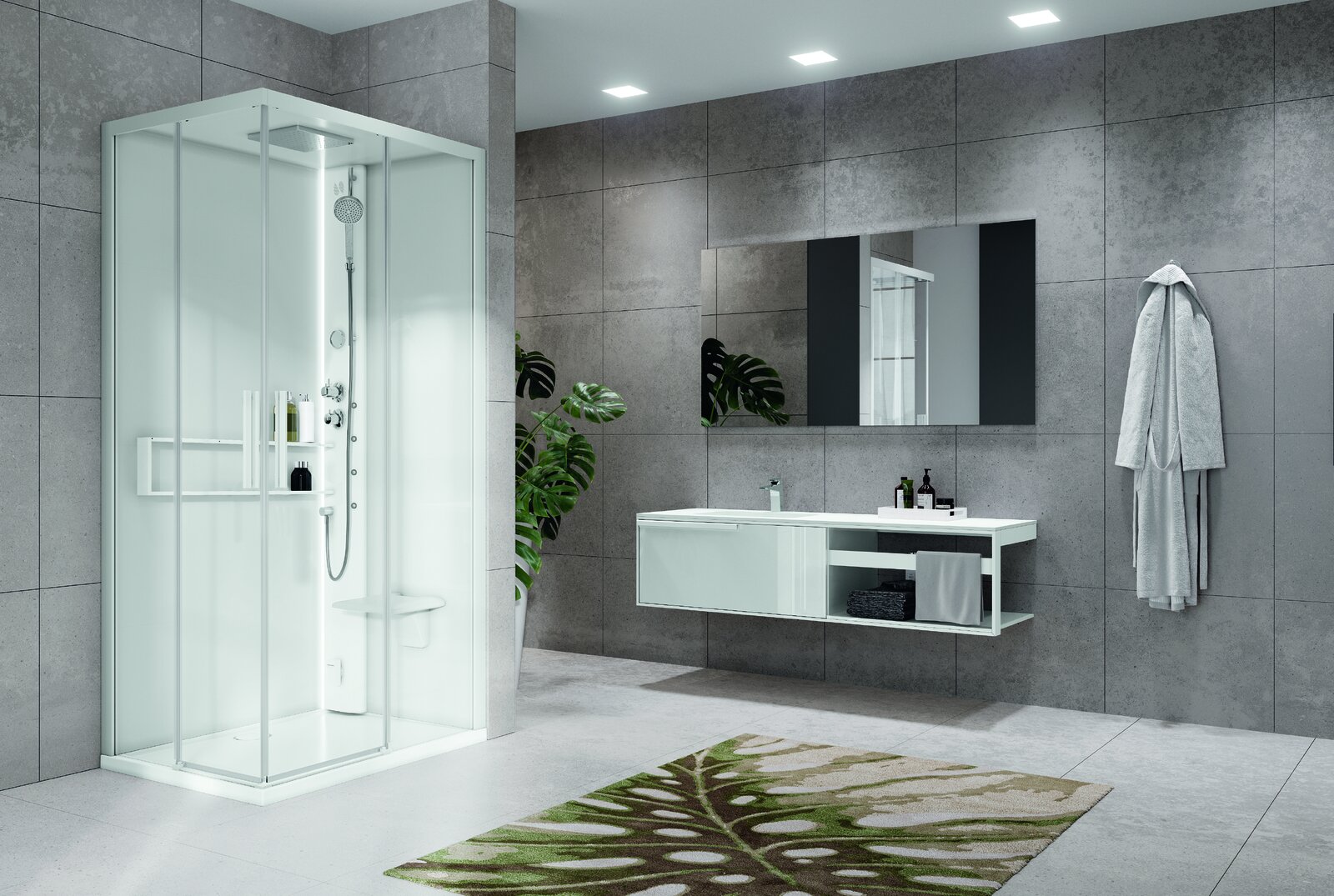 Mit der Multifunktionskabine Glax 2.0 aus dem Hause Novellini holen Sie sich das volle Verwöhnprogramm ins Badezimmer. Das Leitbild der Dampfkabine ist, wie ihr Name schon sagt, wohltuender Dampf mit beruhigenden Düsen. Dieser Dampferzeuger mit einem Aromaspender bringt ein ganz besonderes Erholungsprogramm in Ihre Dusche und lässt Sie das Duschbad mit allen Sinnen genießen. Bestehend aus je zwei Schiebeteilen und Festteilen, präsentiert sich die Eckkabine im edlen Design in strahlend weißer Farbgebung. Praktische Abstellflächen, ein komplettes Duschthermostat samt Brause und ein Klappsitz sind in dieser Komplettdusche natürlich inklusive. Das Massageprogramm verwöhnt dabei mit Funktionen einer Dampfsauna und Rückenmassagedüsen. Gönnen Sie sich ein Stück Luxus mit Spa-Feeling – mit diesem unglaublichen Duscherlebnis aus der Novellini Reihe Glax 2.0