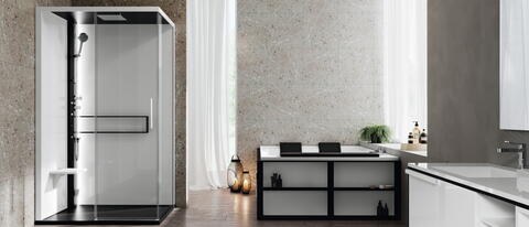 Die Dampfkabine 2P Glax 2.0 von NOVELLINI ist das perfekte Wellness-Programm für Ihr Zuhause. Wohltuender Dampf mit beruhigenden Düsen und Aromaspender sowie die Rückenmassagendüsen versprechen Entspannung auf Knopfdruck und lassen Sie das Duschbad mit allen Sinnen genießen. Dabei kommt die Eckkabine als Komplettpaket: Bestehend aus einer Schiebetür mit Festteil und zusätzlicher Seitenwand, verfügt diese ganz besondere Duschkabine auch über ein praktisches Ablageregal in moderner Optik, den Klappsitz sowie ein komplettes Duschthermostat samt Kopfbrause. Die Designlösung zeigt sich hier in edlem Weiß, gepaart mit braunen Farbdetails an Boden, Decke und Duschpaneel. Setzen Sie Ihren persönlichen Schwerpunkt und wählen Sie zwischen der Hammam- und der Hydro-Ausführung.