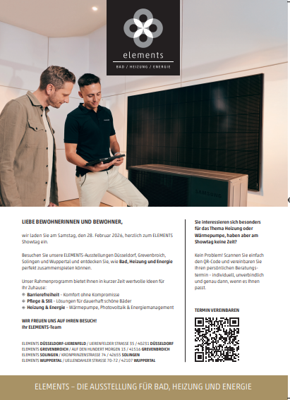 Besuchen Sie unsere ELEMENTS-Ausstellungen in Düsseldorf-Lierenfeld, Grevenbroich, Solingen und Wuppertal und entdecken Sie, wie Bad, Heizung und Energie perfekt zusammenspielen können.