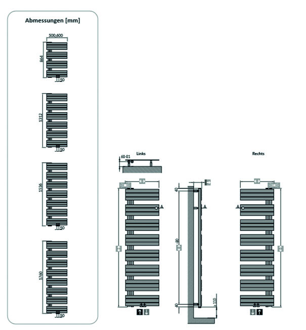 Optional mit links- oder rechtsseitig positionierter Sammelröhre erhältlich. Darüber hinaus stehen verschiedene Bauhöhen, -längen und Farben zur Auswahl.