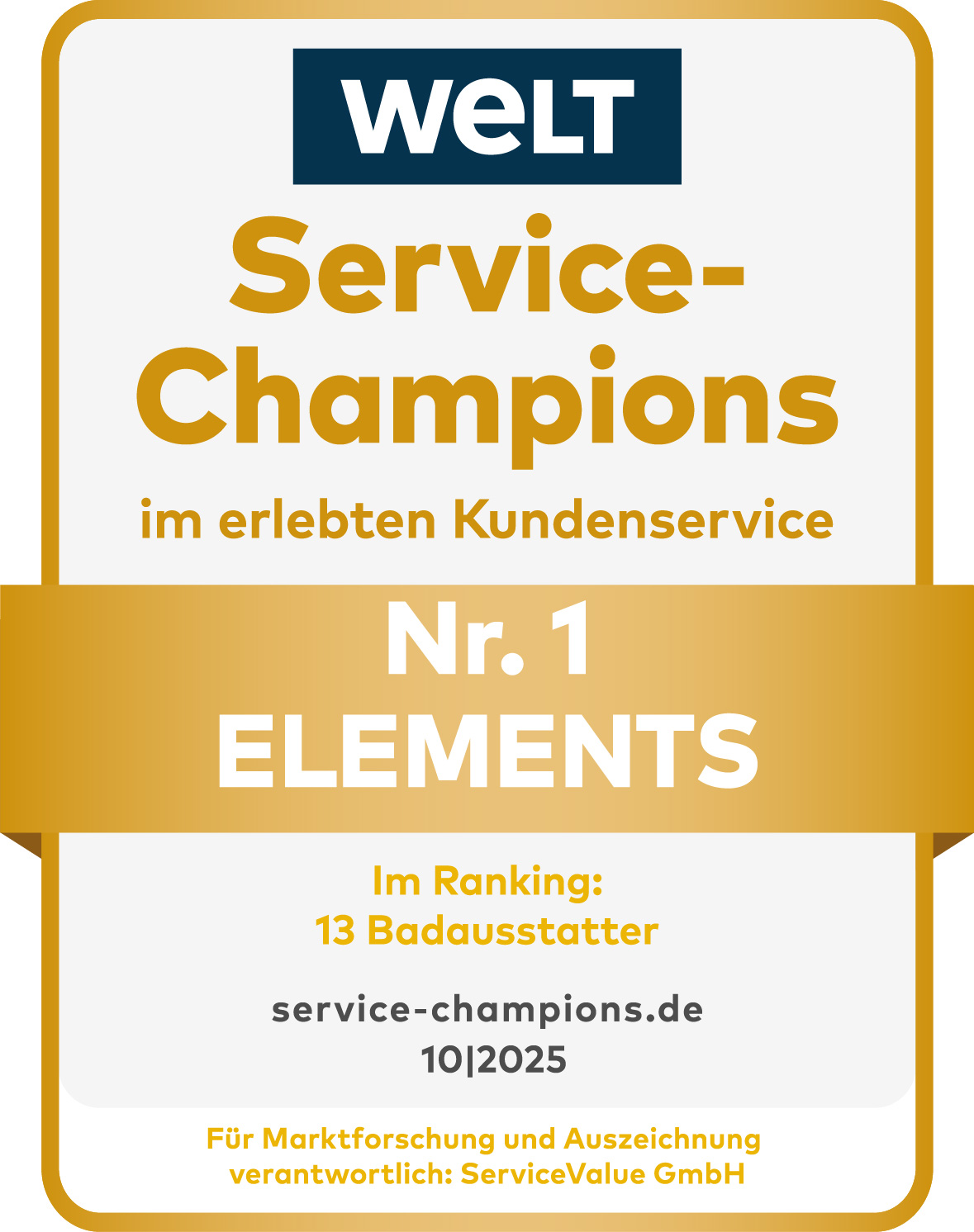 Markus Hahn, Geschäftsführer der ELEMENTS GmbH: „Zehn Mal in Folge zum Service Champion gewählt zu werden, macht uns stolz und motiviert uns zur stetigen Weiterentwicklung. Das Zusammenspiel mit dem Fachhandwerk, aber auch unseren Partnern aus der Industrie ermöglicht dem Endkunden den einfachsten und verlässlichsten Weg zum neuen Bad.“