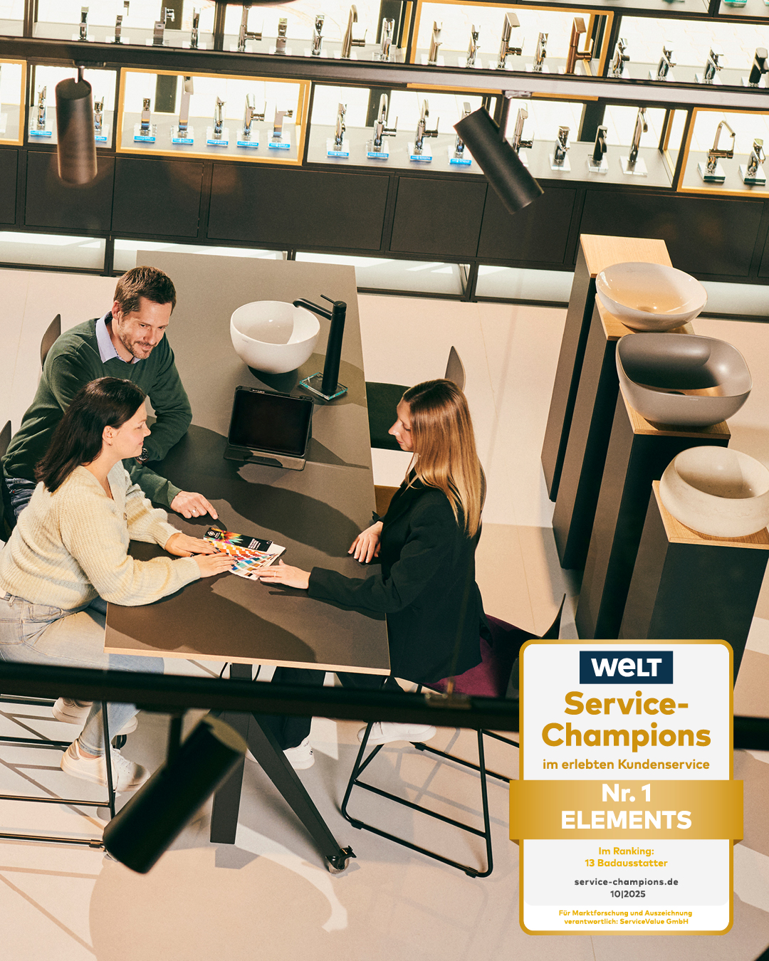Stuhr, 9. Oktober 2025 – Jubel zu einem besonderen Jubiläum: Zum zehnten Mal in Folge feiern die ELEMENTS-Ausstellungen ihre Wahl zum Service-Champion in der Kategorie Badausstatter. Zwei Hände voll guter Gründe also, seinen Traum vom neuen Bad in einem der über 270 Showrooms in Deutschland planen und vom ELEMENTS-Team aus Badverkäufer und Fachhandwerker erfüllen zu lassen. Die erneute Auszeichnung unterstreicht die kontinuierlich hohe Qualität in der Beratung, Planung und Umsetzung des Profi-Netzwerks.
