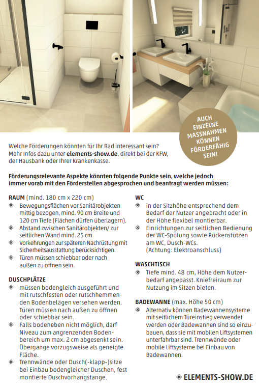 Welche Förderungen könnten für Ihr Bad interessant sein? Auch einzelne Maßnahmen können förderfähig sein. Mehr Infos erfahren Sie von unseren elements-Badberater*innen.